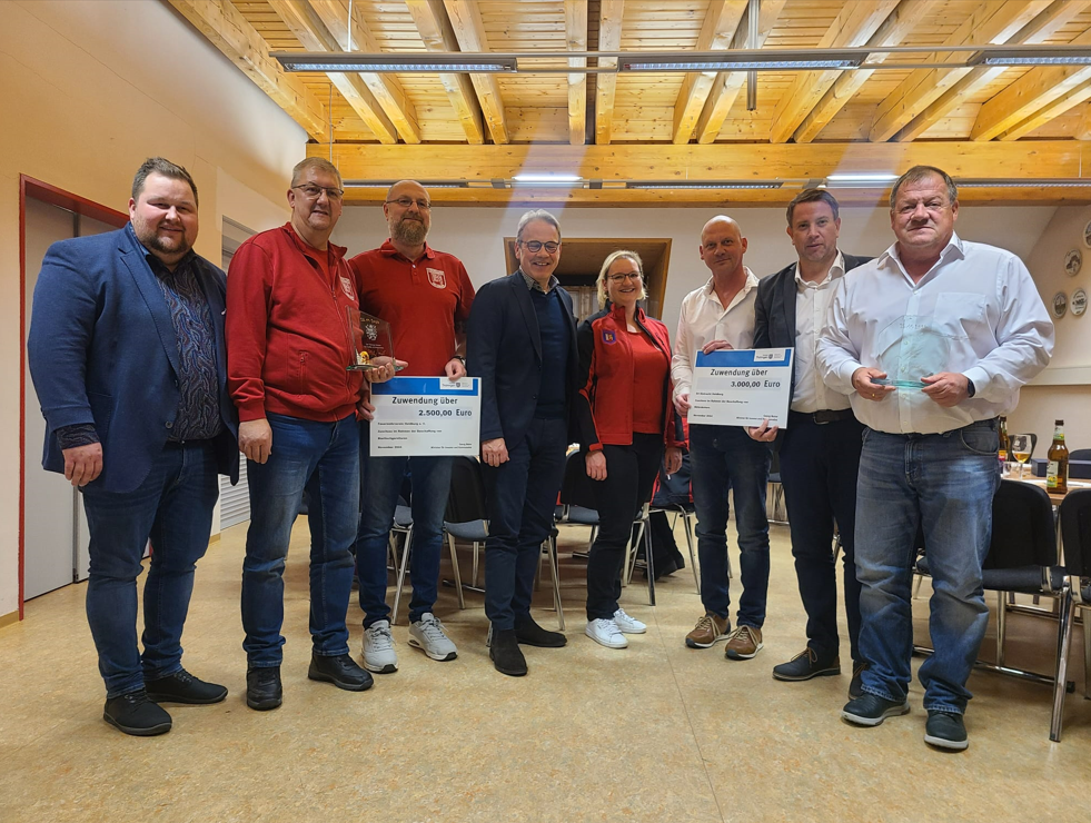 Dem riesigen BMW-Kofferraum entnahm er zwei Schecks und zwei Karton, denn wie heißt es so schön: Kleine Geschenke erhalten die Freundschaft. Ziel des Ganzen war die Übergabe von Zuwendungen, welche für zwei engagierte Vereine der Stadt Heldburg vorgesehen waren. Die Vorsitzenden des Feuerwehrvereins und des Sportvereins Eintracht Heldburg erhielten dann aus der persönlichen Hand des Innenministers Thüringens, Georg Maier, jeweils einen Scheck über Lottomittel und eine gläserne wertvolle Erinnerung mit persönlicher Minister – Signatur.